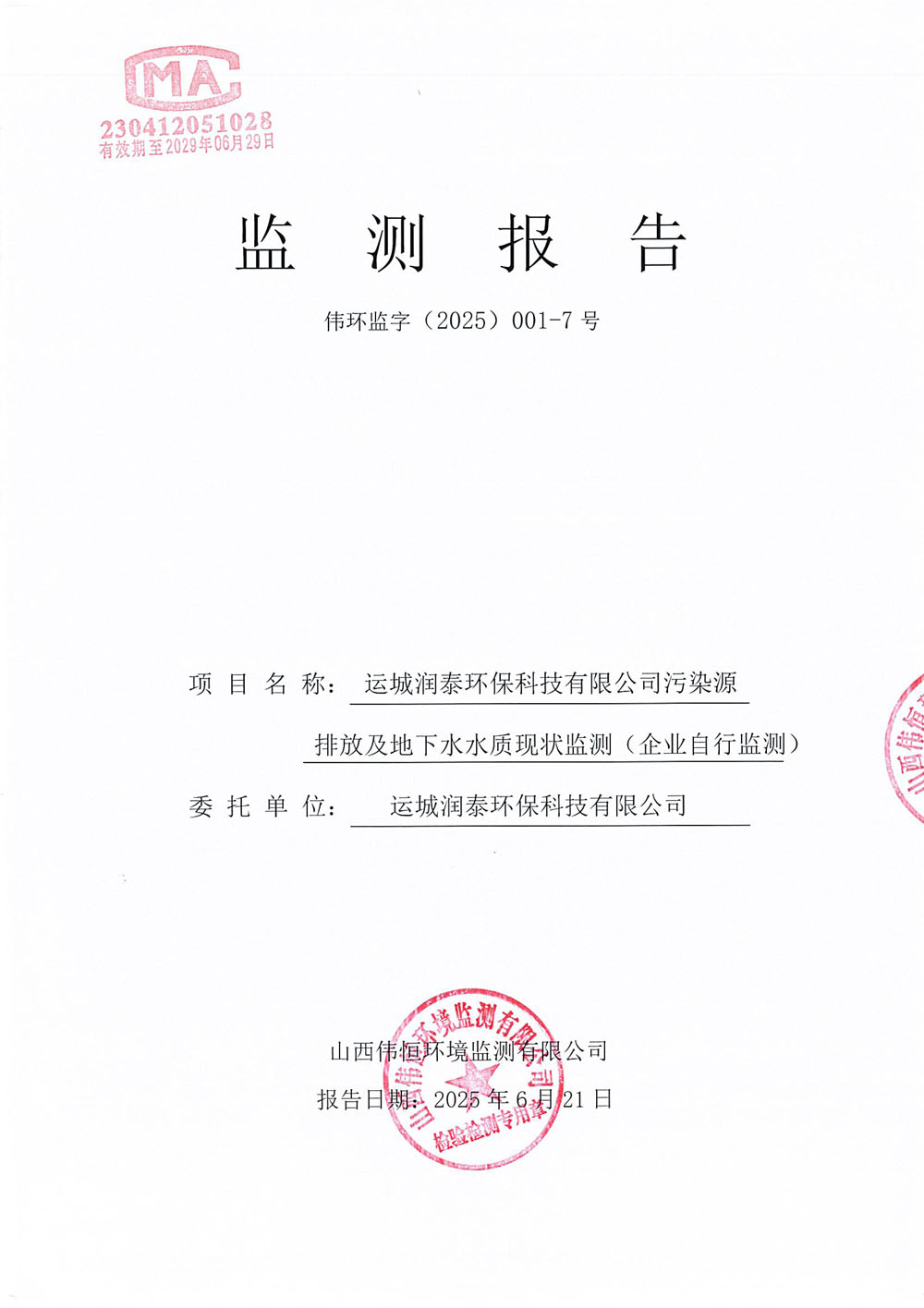 2025年潤(rùn)泰環(huán)保六月份自行監(jiān)測(cè)報(bào)告